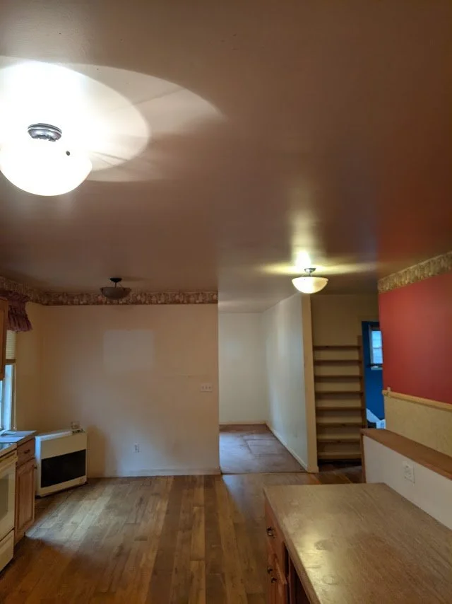 When we first bought our house, it reeked of animal urine and cigarette smoke. The walls were yellow from nicotine stains. It had flooring that was peeling up and stained carpets on which I was scared to let my toddler play or sit. You can see some of this process pictured above.